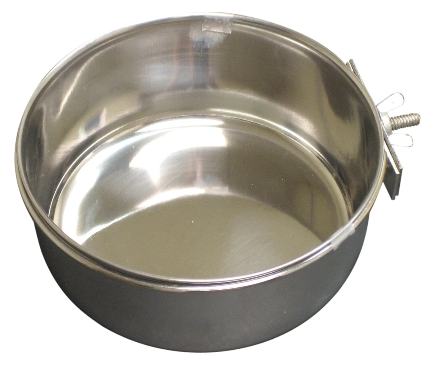 Use these quality stainless steel hanging food cups for dogs, birds and other pets. With a clamp style attachment, uses include in dog crates, parrot cages, coops, etc.