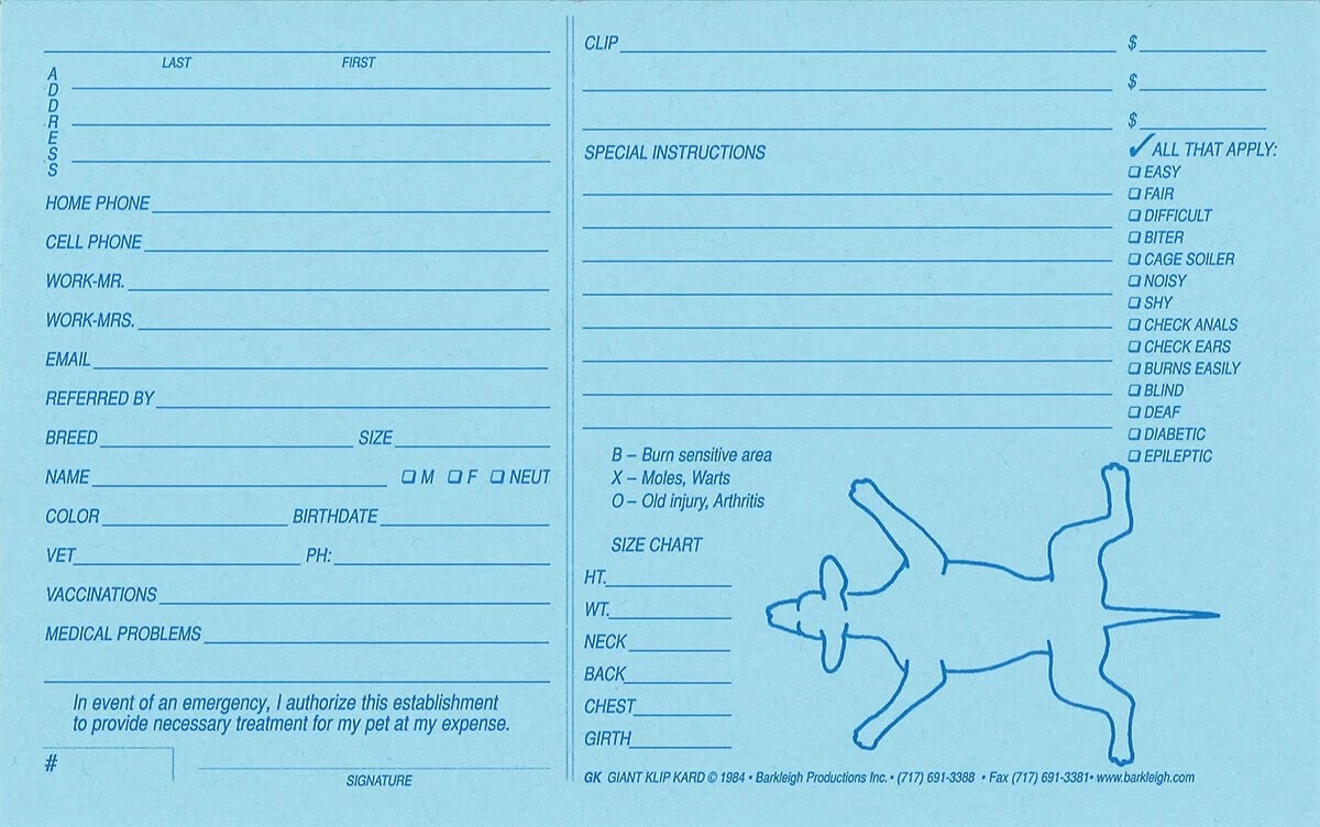5″ x 8″ Klip Kard features a dog diagram for notation of old injuries, warts and sensitive areas. Sketch the clip right on the card. Emergency permission included, plus a size chart for easy sales reference. Includes Pet Profile checklist with lots of space on the back for date, charges, services, groomer and reminder sent date.