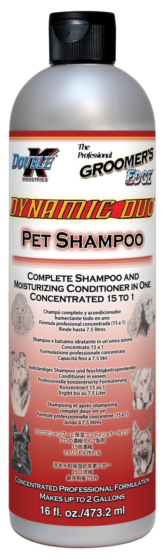 DYNAMIC DUO® combines a rich shampoo with a super conditioner to cut bathing time in half! No need to follow with a separate conditioner or rinse. Luxurious formula is fortified with Panthenol, Aloe and Vitamin E. Lathers well and rinses easily, leaving hair easy to comb out, with spectacular shine. Mild and specially pH balanced for pets. Rich formula is gentle and may be used regularly for show ring results. Great for groomer’s/bather’s hands. For use on dogs, cats, puppies, kittens and all companion and farm animals. Concentrated 15 to 1.