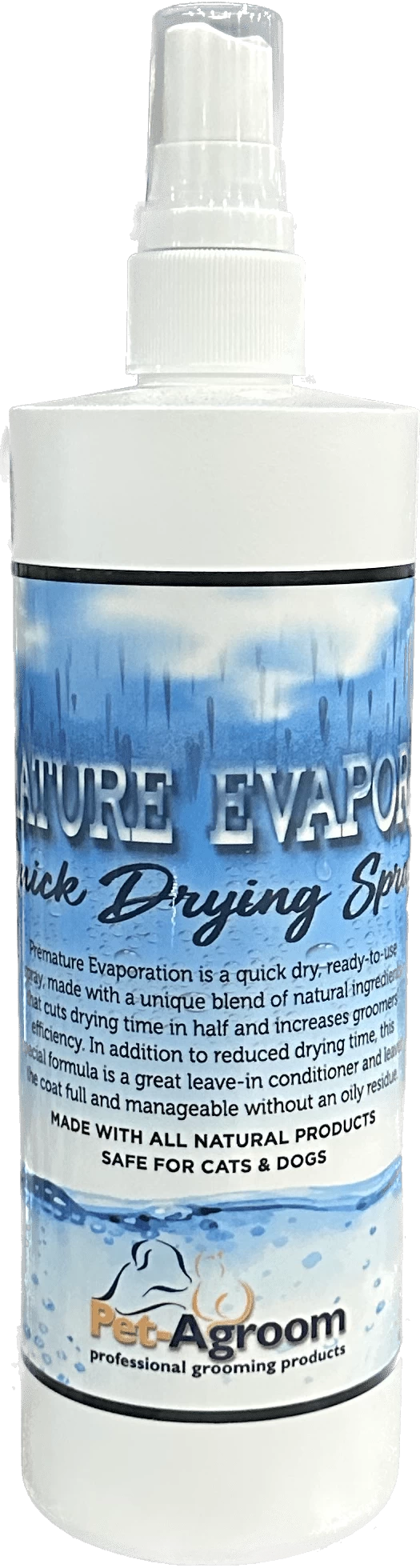 Premature Evaporation is a quick dry, ready-to-use spray, made with unique blend of natural ingredients that cuts drying time in half and increases groomers efficiency.