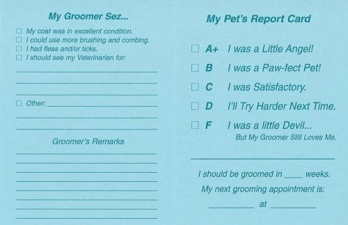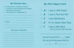 Like a teacher, now you can grade each pet from an A+ to an F. Did you ever forget to convey important information to your client? A time-saving check-list of common recommendations is included, with space for your personal comments. Plus, it doubles as a reminder or appointment card. Great promotional tool, too – your clients will tell their friends about your “caring” pet report card.