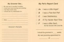 Like a teacher, now you can grade each pet from an A+ to an F. Did you ever forget to convey important information to your client? A time-saving check-list of common recommendations is included, with space for your personal comments. Plus, it doubles as a reminder or appointment card. Great promotional tool, too – your clients will tell their friends about your “caring” pet report card.