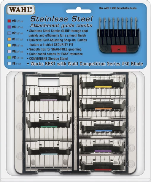 Universal, self-adjusting, snap-on combs. Stainless steel combs glide through coats easily and efficiently for a smooth coat finish. Smooth tip mean snag-free grooming and the (4) sided security fit practically eliminates the worry of grooming mistakes.Sold individually or in a set. The comb set contains (8) sizes. Each comb is color-coded for easy visual reference. Includes storage stand.Sizes: 1/8”, 1/4”, 3/8”, 1/2”, 5/8”, 3/4”, 7/8”, 1”.